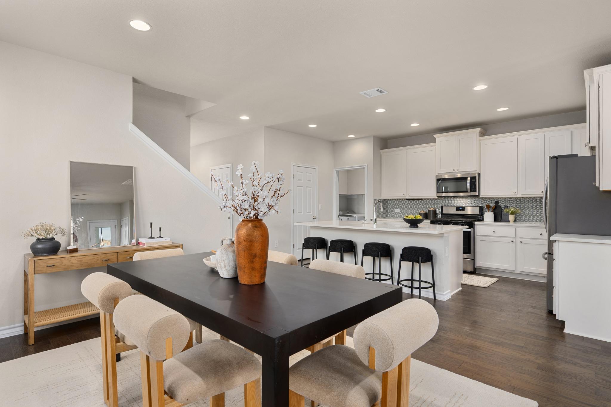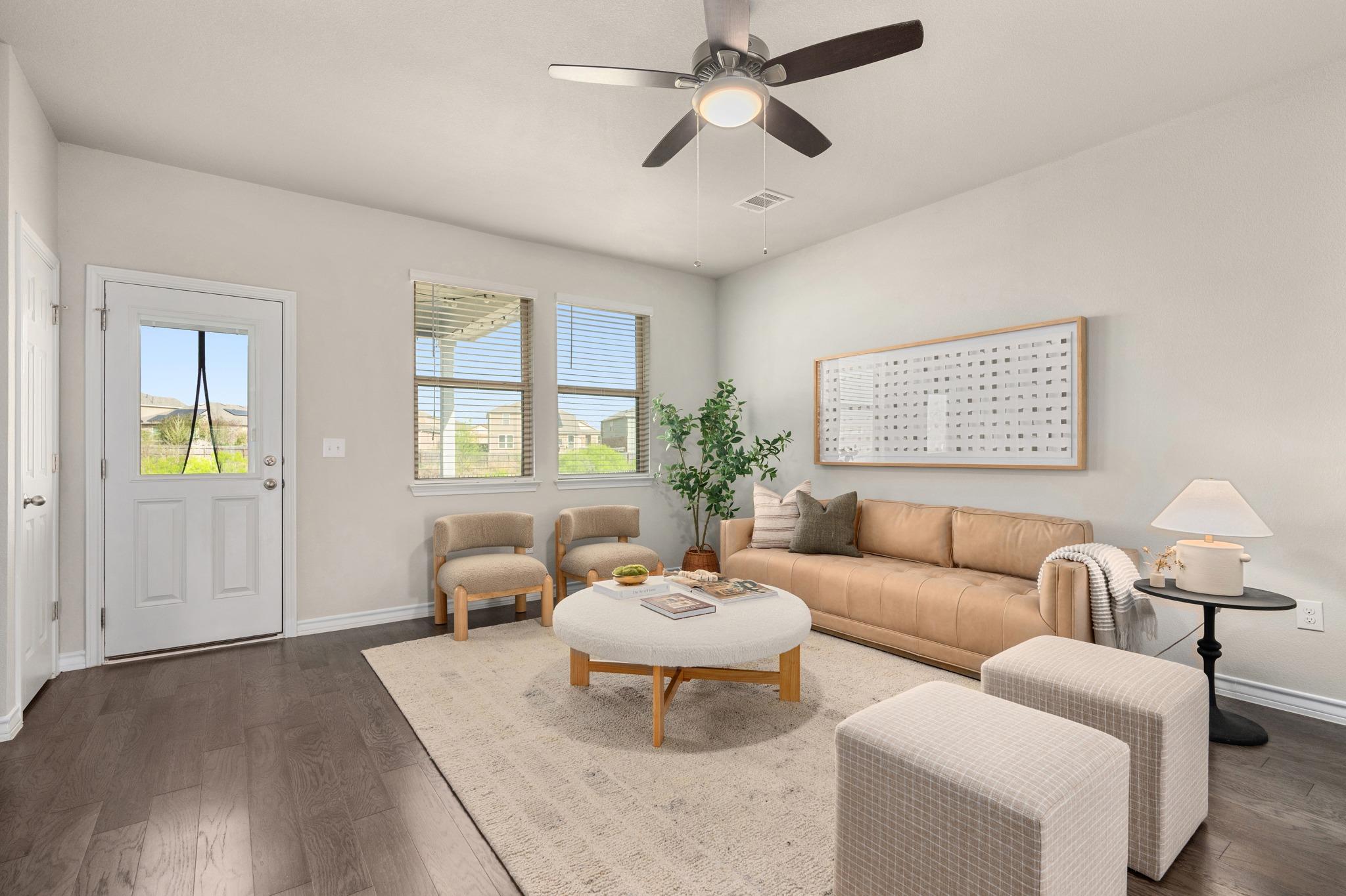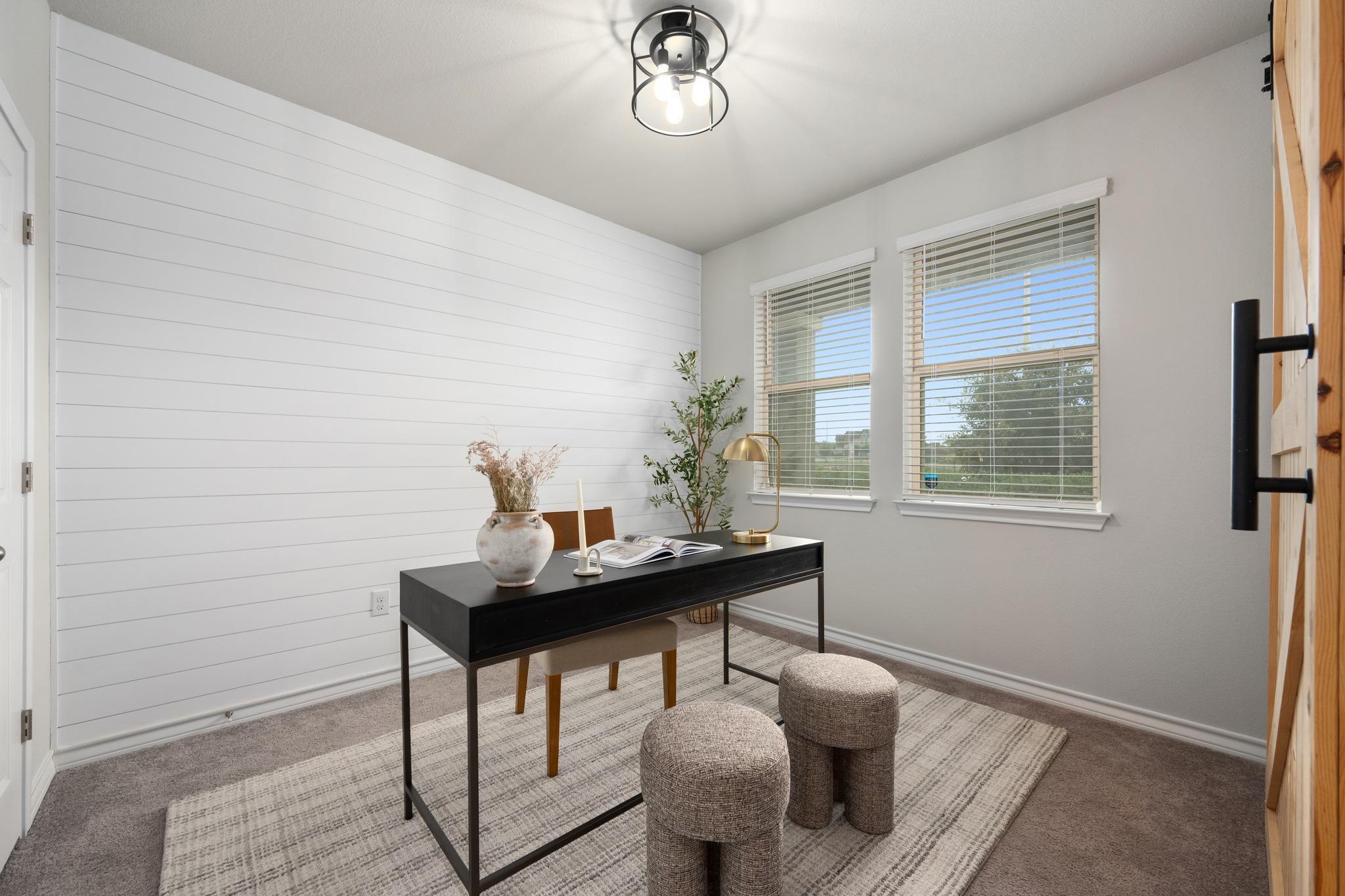 Located at the end of a cul-de-sac, this home is a Taylor Morrison build where smart design and everyday comfort come together effortlessly. The layout feels intentional and welcoming, with spaces that flow naturally and make the home easy to settle into from the moment you arrive. Inside, the main level opens into a bright, living space that brings the kitchen, dining area, and Great Room together in an easy, livable way. The kitchen is both functional and inviting, anchored by a large island, generous white cabinetry, and a walk-in pantry that keeps daily essentials neatly organized while staying close at hand. Whether it's a casual weeknight dinner or a full house, the space adapts beautifully. Just off the entry, a dedicated office with a shiplap accent wall offers a quiet, comfortable place to work or study, thoughtfully separated from the main living areas. The primary suite is tucked away at the back of the home, creating a sense of privacy and retreat. It features a spacious walk-in closet and an en-suite bath with dual vanities, designed for both comfort and ease. A well-placed laundry room and stylish powder room complete the first floor, all conveniently located as you enter from the attached two-car garage. Upstairs, three generously sized secondary bedrooms, each with walk-in closets, share a full hall bath, while a versatile family room provides flexible space for relaxing, entertaining, or everyday overflow. Out back, the fully fenced yard and expansive patio extend the living space outdoors, making it ideal for gatherings, weekend barbecues, or quiet evenings at home. Solar panels add energy efficiency, and the home's location places you just minutes from the emerging East Village development, offering easy access to shopping, dining, and future amenities. Thoughtfully designed, move-in ready, and quietly confident in its appeal, 11820 Offaly Drive offers a comfortable, well-balanced home in a location that continues to grow in all the right ways.