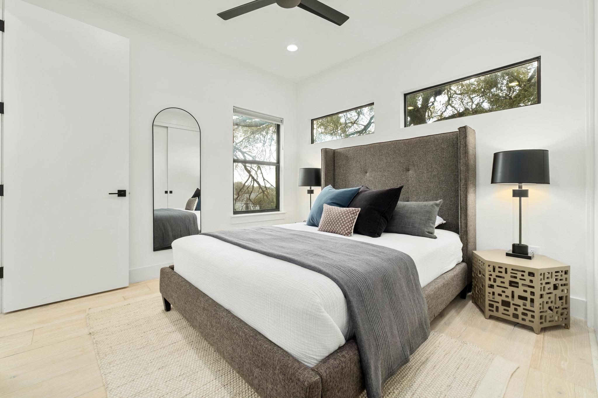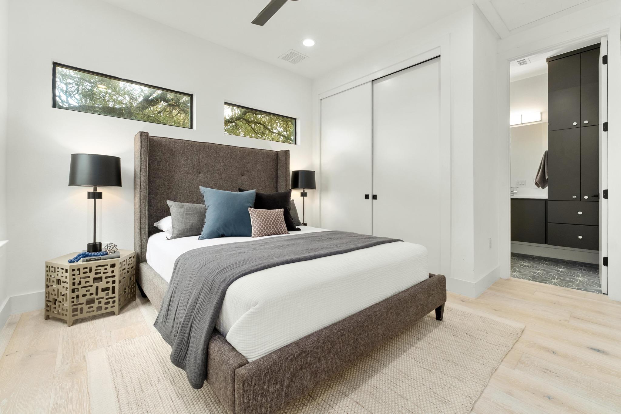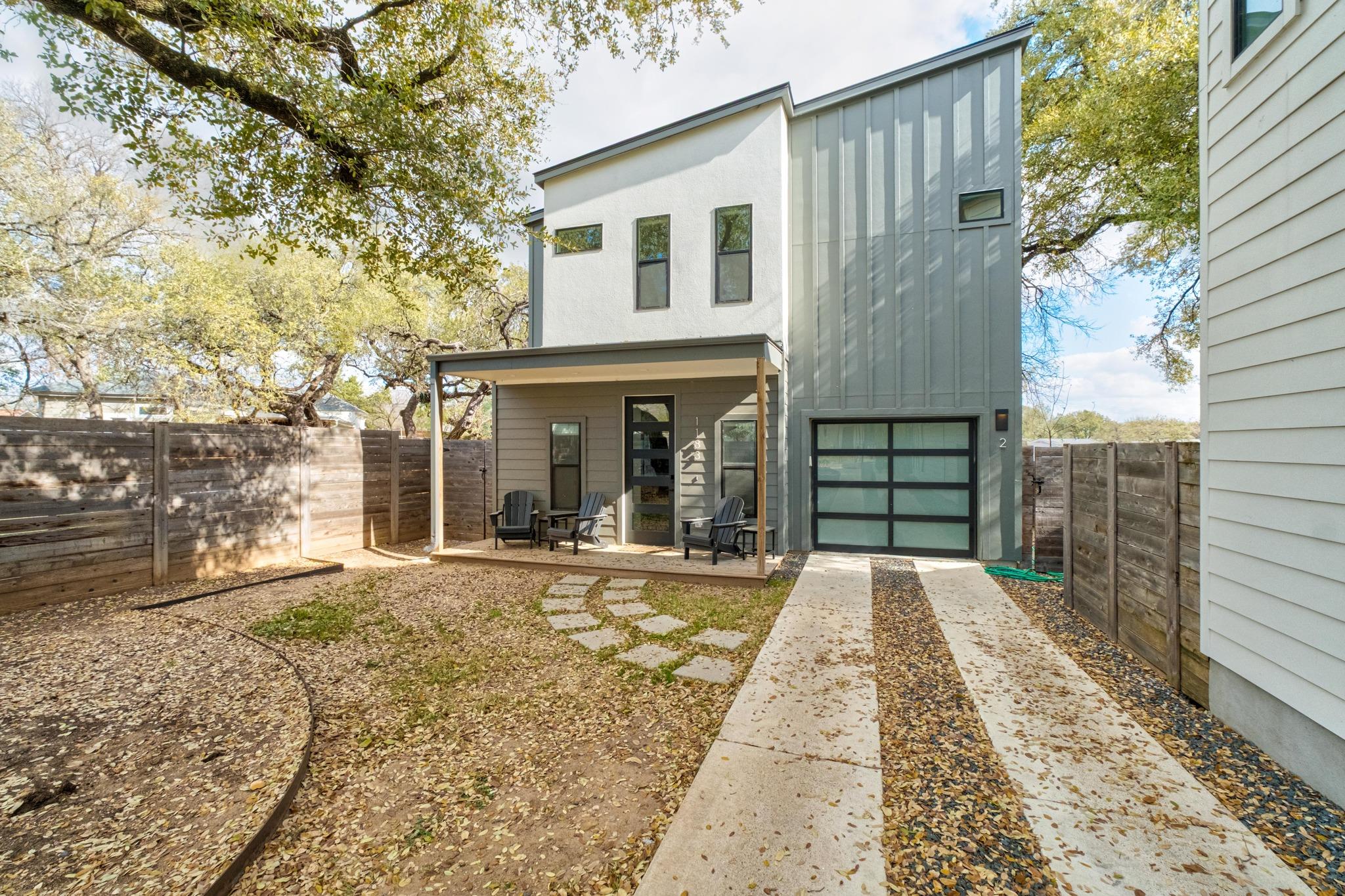 This East Austin home includes a one-car garage, covered wood deck, gorgeous live oaks, and a modern, East Austin vibe. This home has beautiful windows and natural light throughout, hardwood, concrete and tile floors, and a great flow! Stairs lead to both bedrooms with ensuite baths and spacious closets.