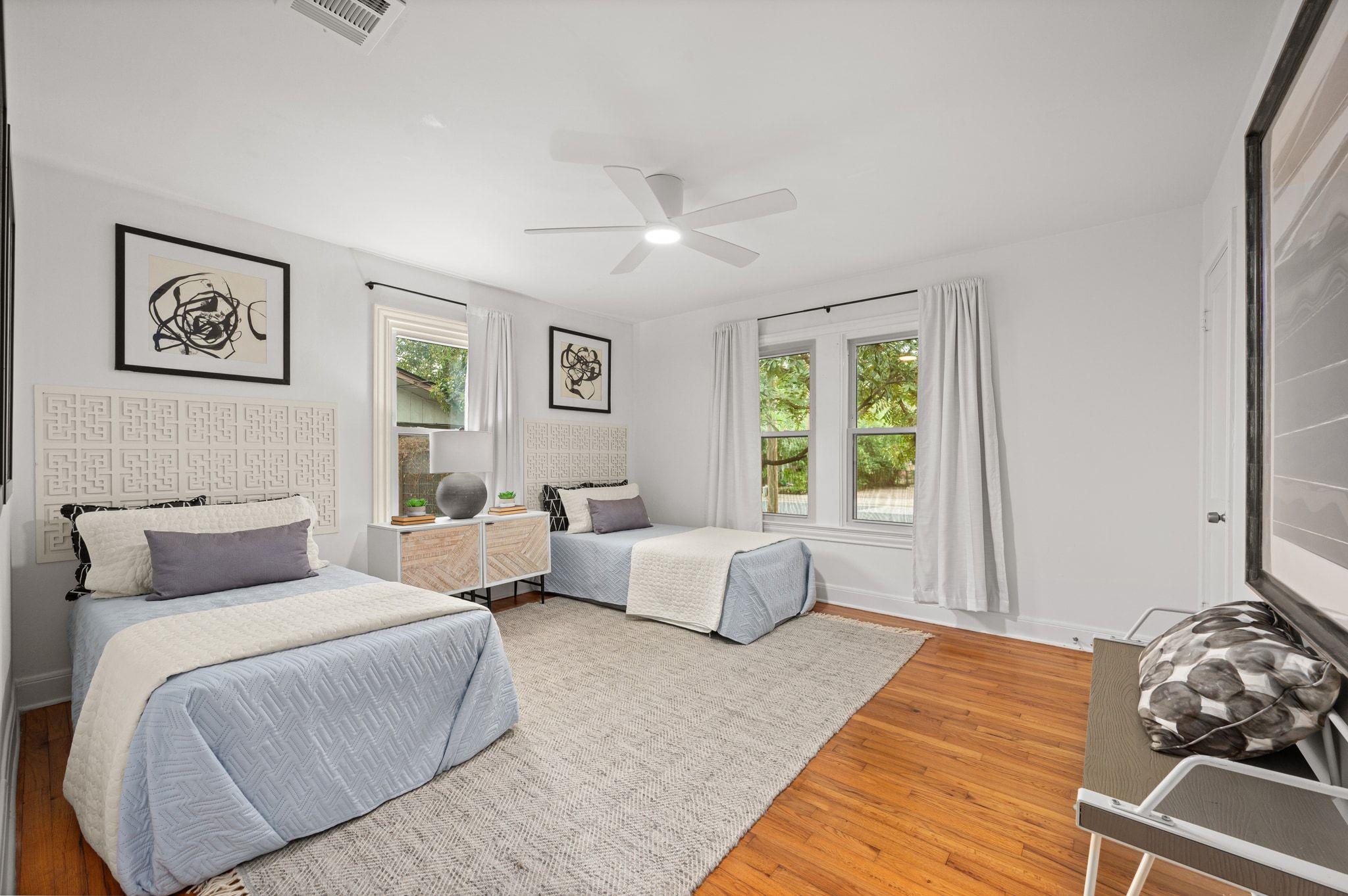 Paying homage to the home's heritage, original wood floors sprawl through the main living / dining and well appointed bedrooms with a large walk-in w/ tailored shelving. The spacious kitchen now sports new cabinetry, quartz counters offer ample space for food prep, updated flooring and stainless appliances while providing backyard views and a wealth of sunlight thru the wall of windows along the back of the home.