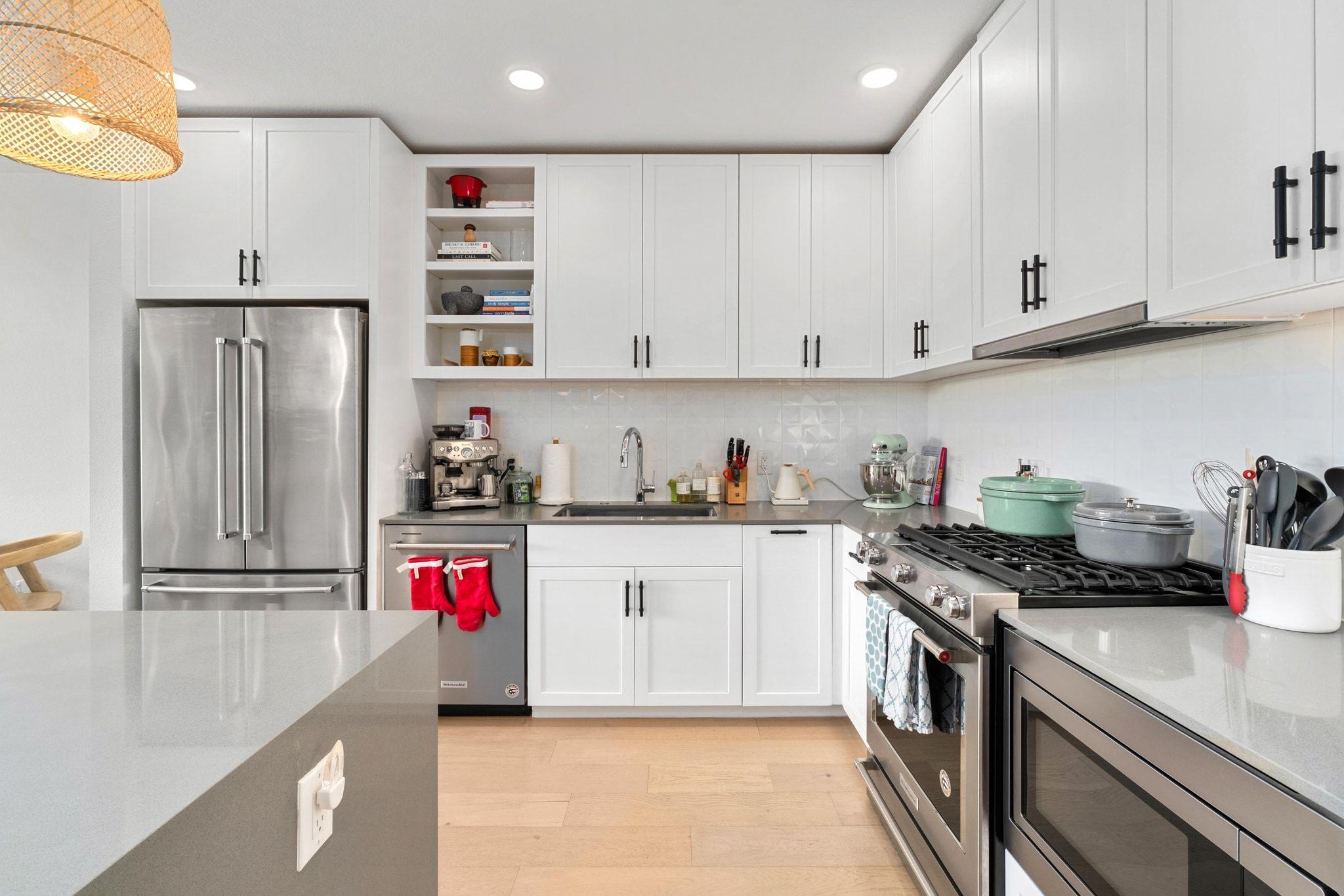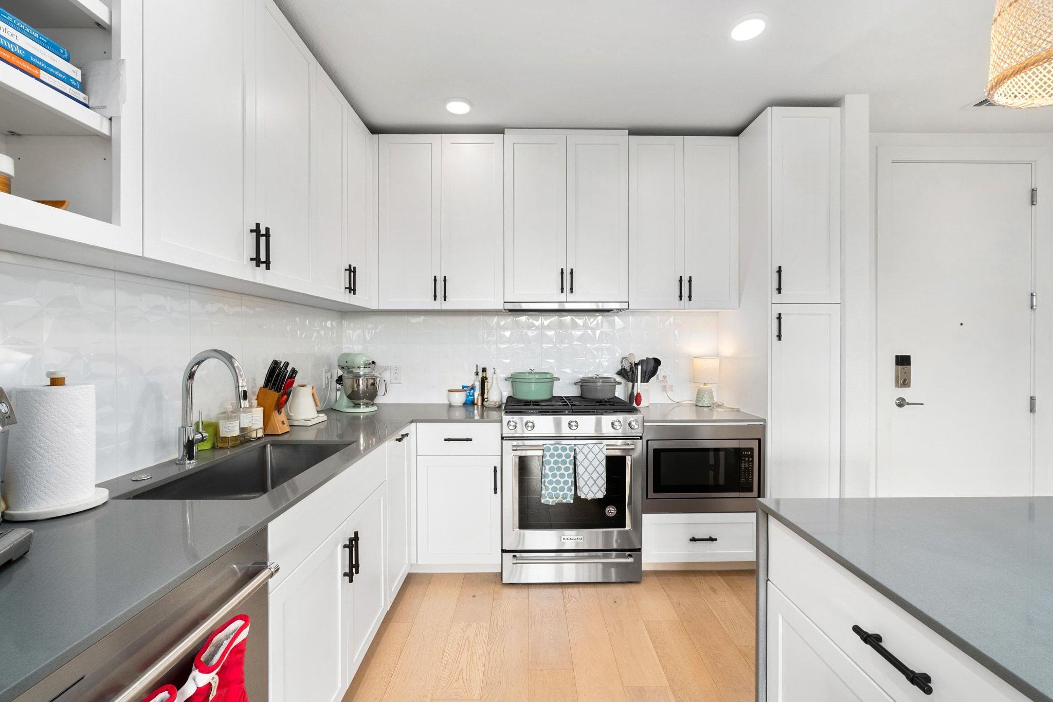 Residents enjoy a secured private garage with an assigned parking space, plus access to a boutique community of fewer than 60 units with shared amenities such as grilling stations, gathering areas, and a dog run.