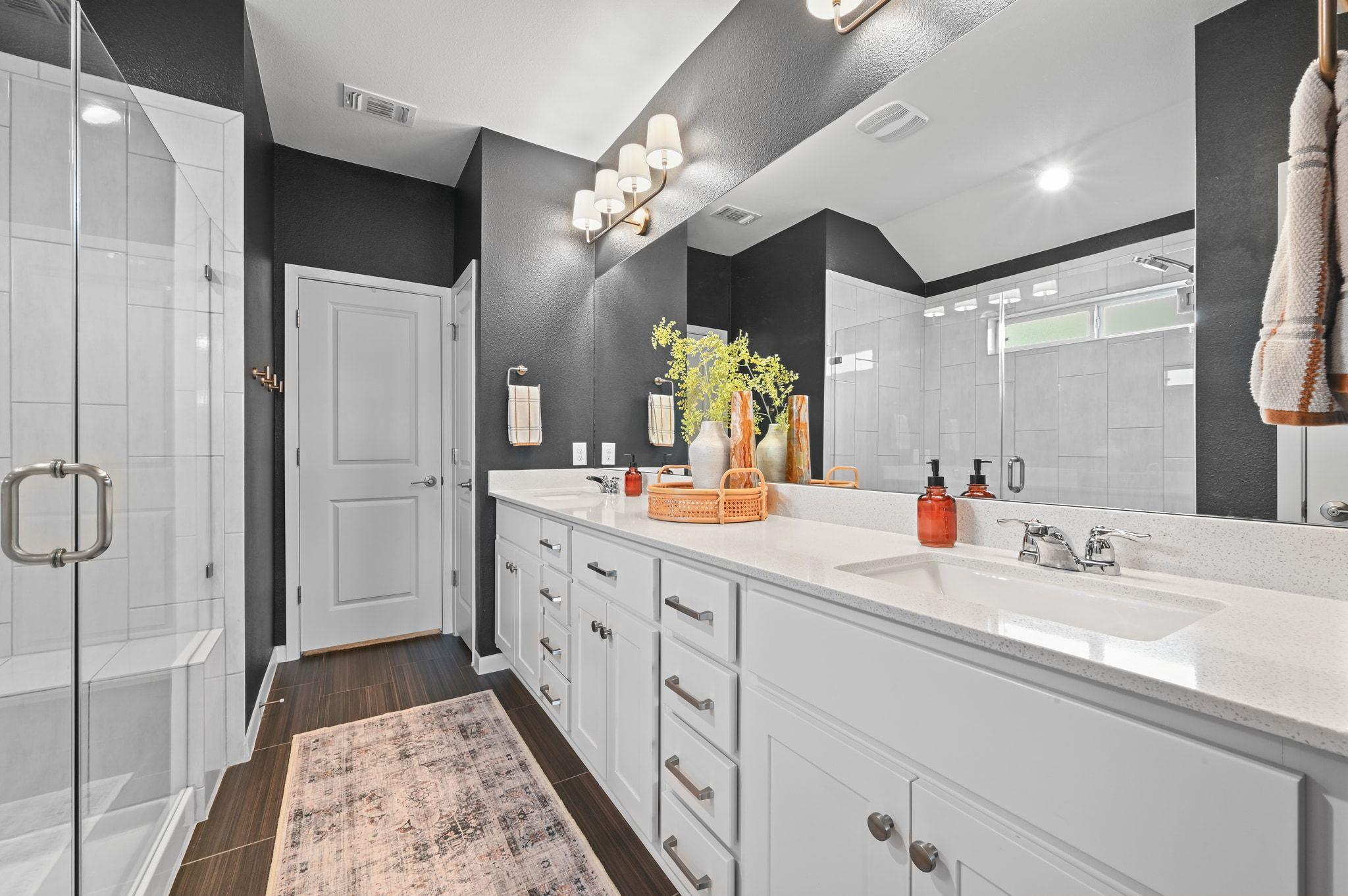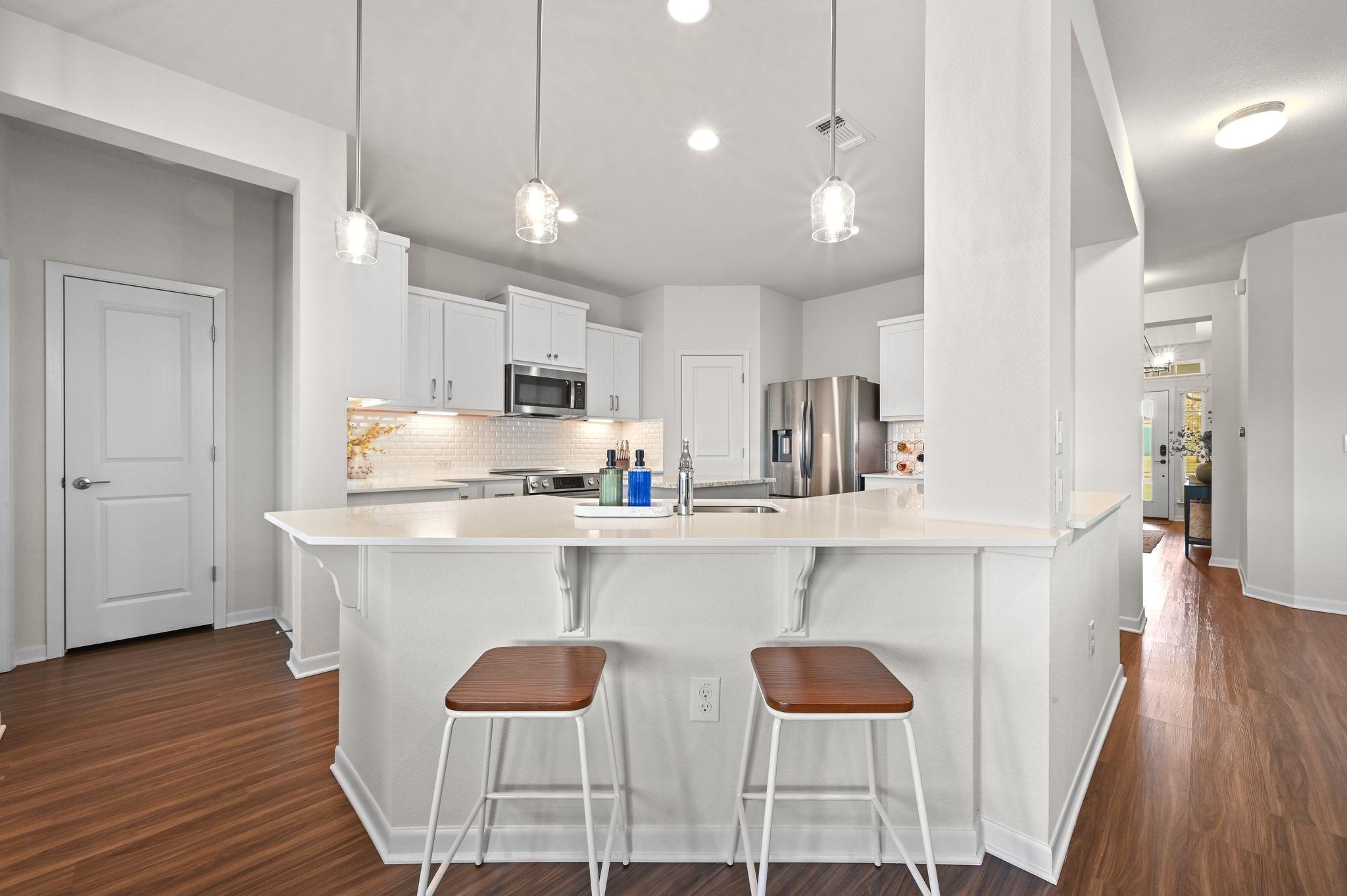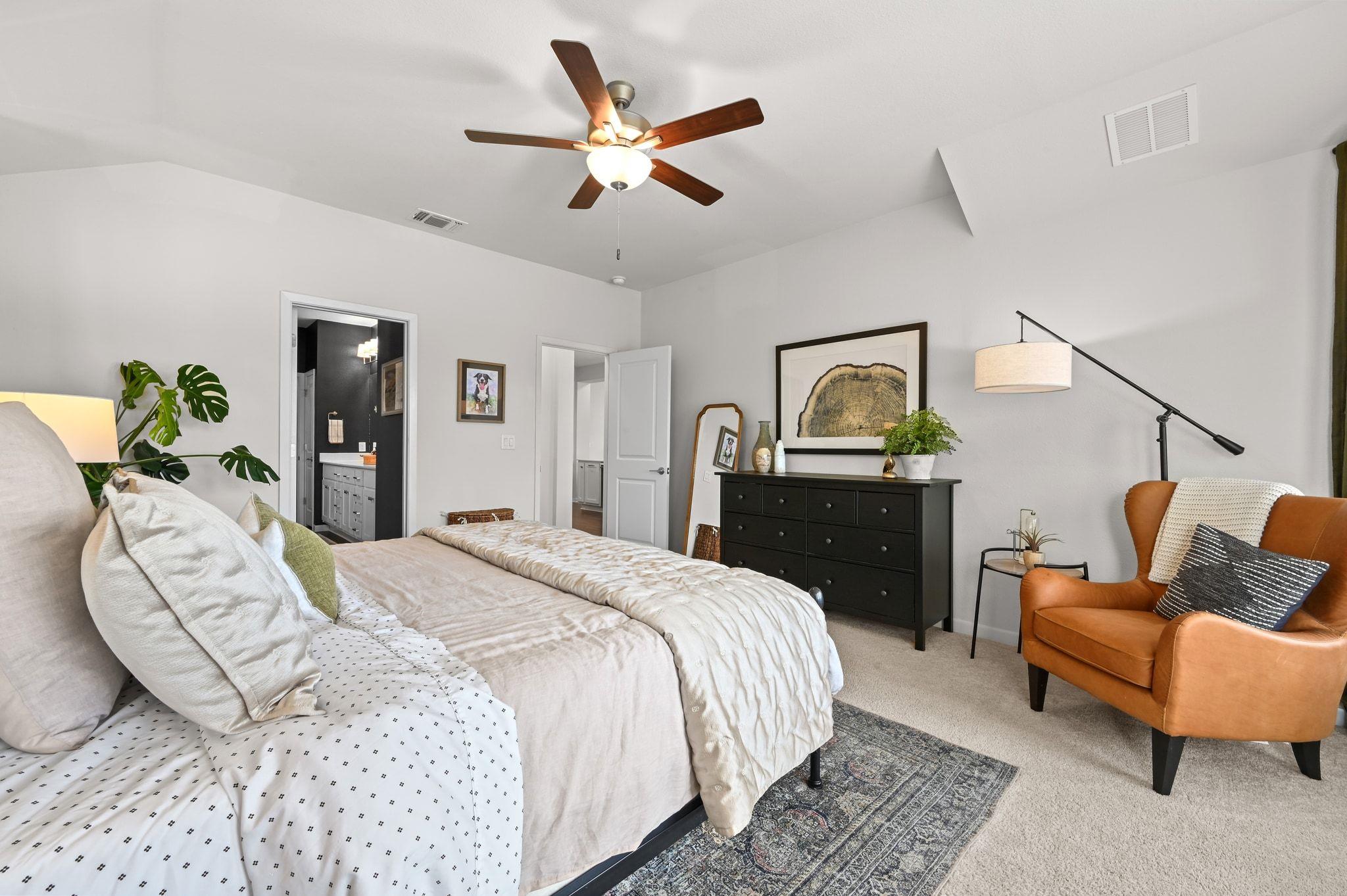This rare single-story home offers a location that can't be beat in the highly sought-after, master-planned Whisper Valley community. Perfectly positioned on the largest available lot size (60-foot), this home is one of only 7 in the community which backs to the greenbelt & tranquil pond - offering privacy & natural beauty. Owners have elevated above the standard builder specs to include upgraded cabinetry, modern hardware, light fixtures, & a completely renovated guest & primary bathroom (see attached list of upgrades). Additionally, the home includes vinyl plank flooring, quartz countertops, & Bosch kitchen appliance upgrades. The kitchen flows effortlessly into the main living space & opens to the extended patio through a three-panel sliding glass door, while the primary bedroom bay windows enhance natural light & peaceful views. Outdoor living shines w/ the extended patio, ideal for entertaining or enjoying peaceful mornings overlooking the pond. Functionality & curb appeal have been equally prioritized with new gutters, freshly painted fencing, & custom landscaping. The home is also zero-energy capable, featuring owned solar panels & a geothermal system that provide exceptional energy efficiency & meaningful long-term cost savings--an increasingly rare & valuable advantage. Located just 2 doors down from the mailbox & pocket park, this home is perfect for a community forward lifestyle. Beyond the home itself, Whisper Valley offers a truly unmatched community experience, spanning over 2,000 acres w/ hundreds of acres dedicated to parks, greenbelts, lakes, & miles of scenic hike-and-bike trails. Residents enjoy a resort-style pool, a state-of-the-art fitness center, playgrounds, dog parks, & organic community gardens, along w/ a full calendar of lifestyle programming.