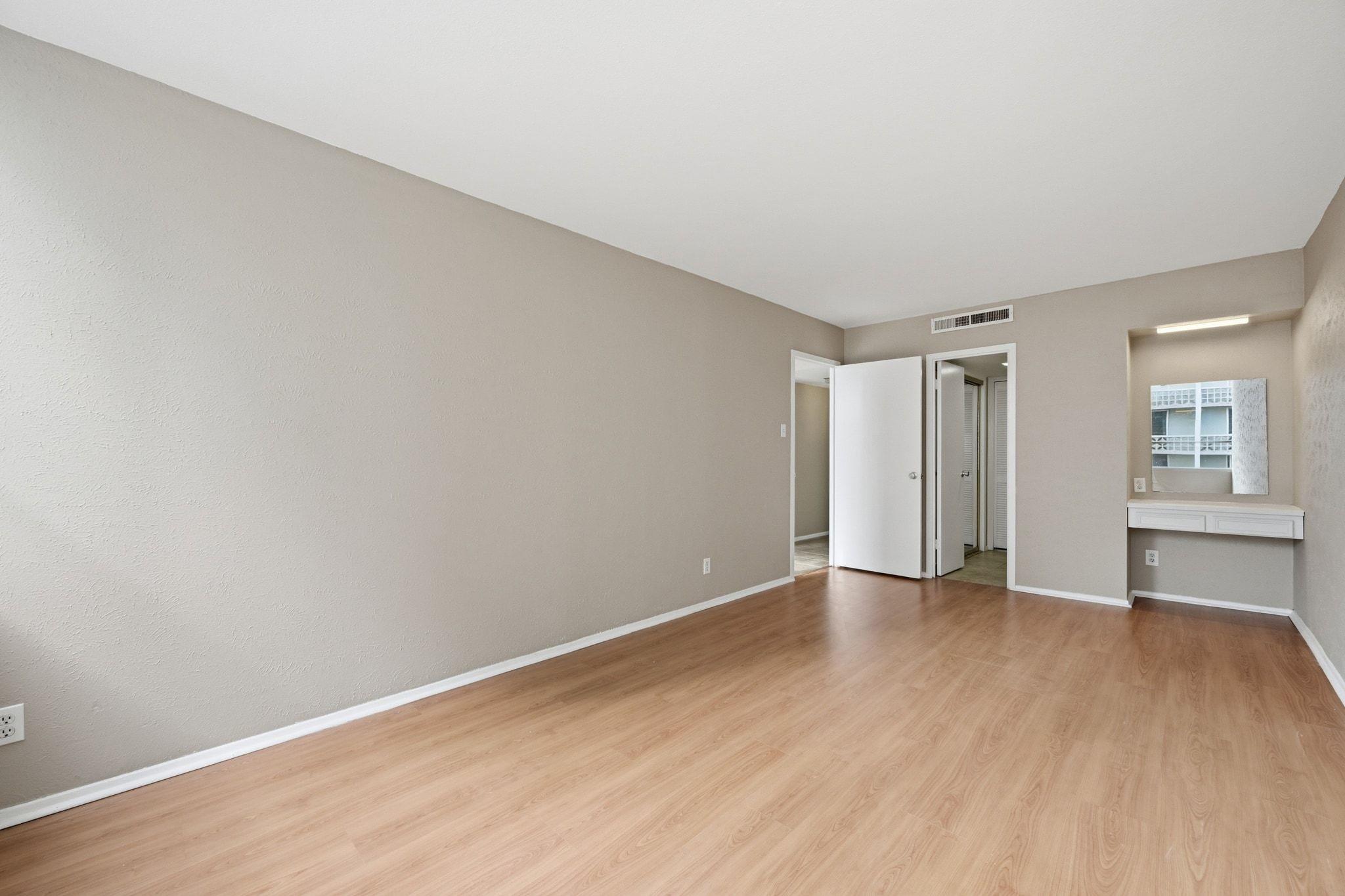 The bedroom offers wood-like laminate flooring and includes a built-in workstation, making it ideal for students, remote professionals, or anyone needing a dedicated workspace at home. The updated bathroom features a walk-in glass shower, modern tile surround, and contemporary vanity, adding a clean, refreshed finish to the home.