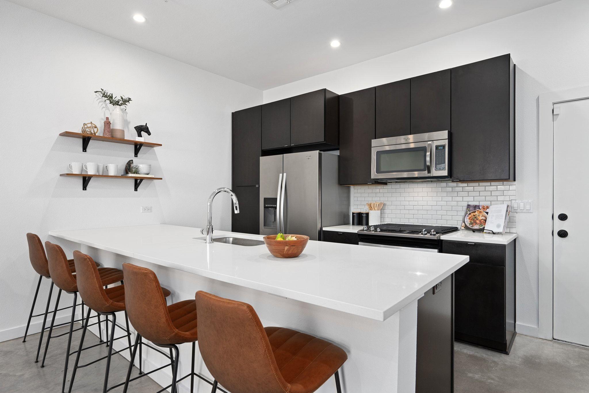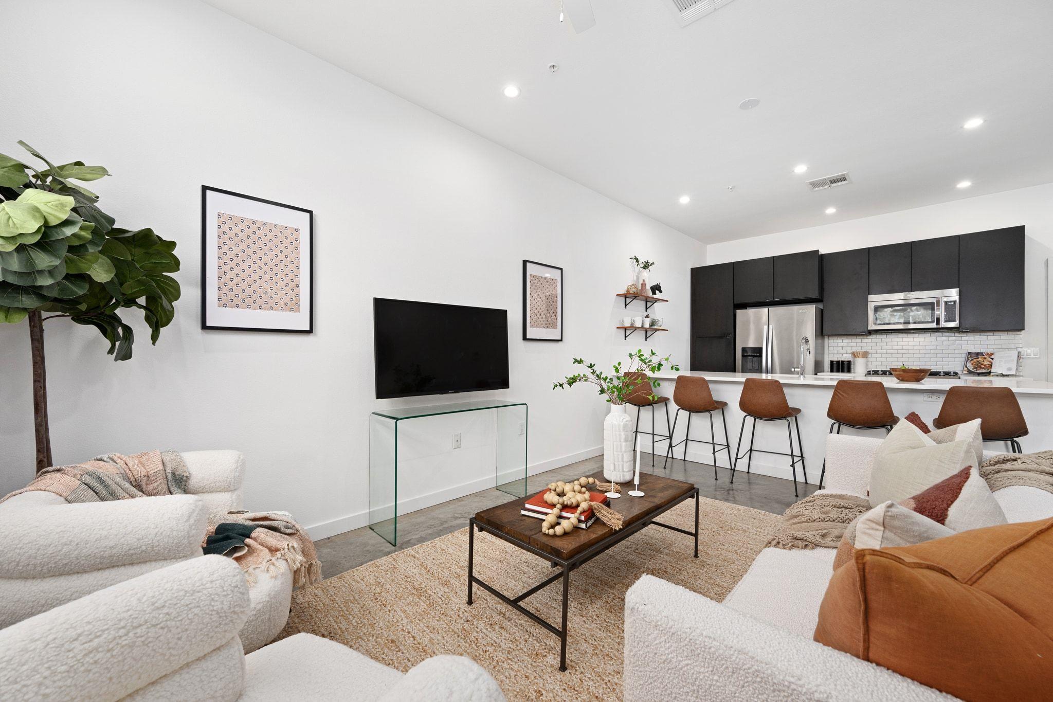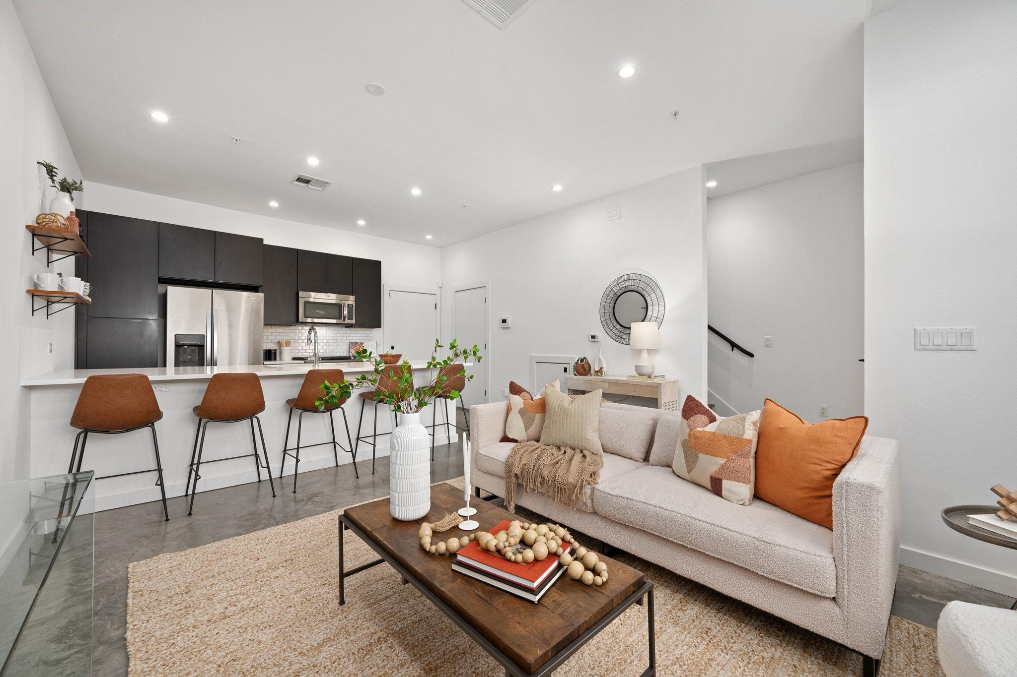 Set in the heart of Avion Park, 1931 E 38 1/2 St #43 delivers contemporary design, effortless livability, and one of Mueller's most enviable front-row positions across from the 32-acre Southwest Greenway. Step outside and you're moments from acclaimed restaurants, boutique shopping, the Mueller Farmer's Market, and everyday conveniences, all wrapped in the rare luxury of true walkability. Inside, the home unfolds in clean architectural lines and light-filled volume. Soaring ceilings, polished concrete floors, and expansive windows create an airy, modern atmosphere that feels both intentional and inviting. The kitchen anchors the main level with quartz countertops, stainless steel appliances, a gas range, subway tile backsplash, and sleek cabinetry with built-in pantry storage. A generous peninsula provides a natural gathering point for casual meals or evening conversation. Upstairs, the primary suite is a serene retreat with vaulted ceilings, oversized windows, a spa-inspired bath, and a spacious walk-in closet. A secondary bedroom is complemented by a versatile third flex space, ideal for a home office, studio, or additional sleeping area. An upstairs laundry closet and main-level powder room add everyday ease. The lock-and-leave lifestyle is enhanced by beautifully maintained grounds, a community dog park, and HOA coverage that includes water, wastewater, trash, structural insurance, and common-area maintenance. An attached two-car garage completes the package. Just four miles from Downtown and minutes from UT, this residence offers a rare blend of urban energy and greenbelt tranquility. A refined, low-maintenance home in one of Austin's most sought-after condo communities.