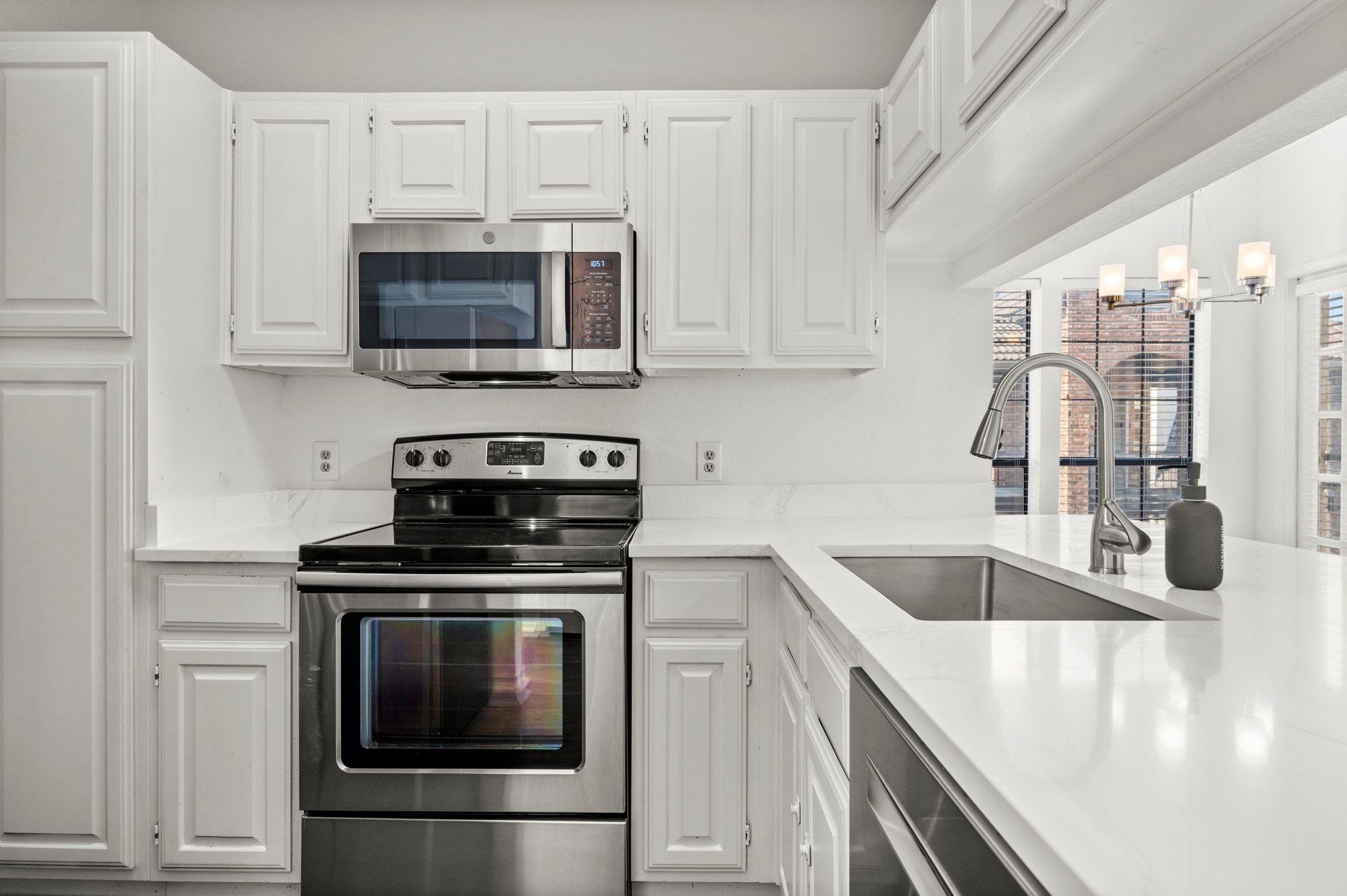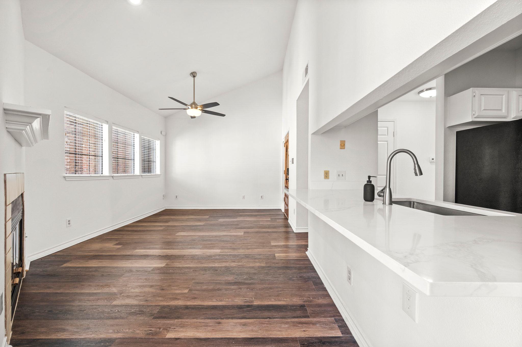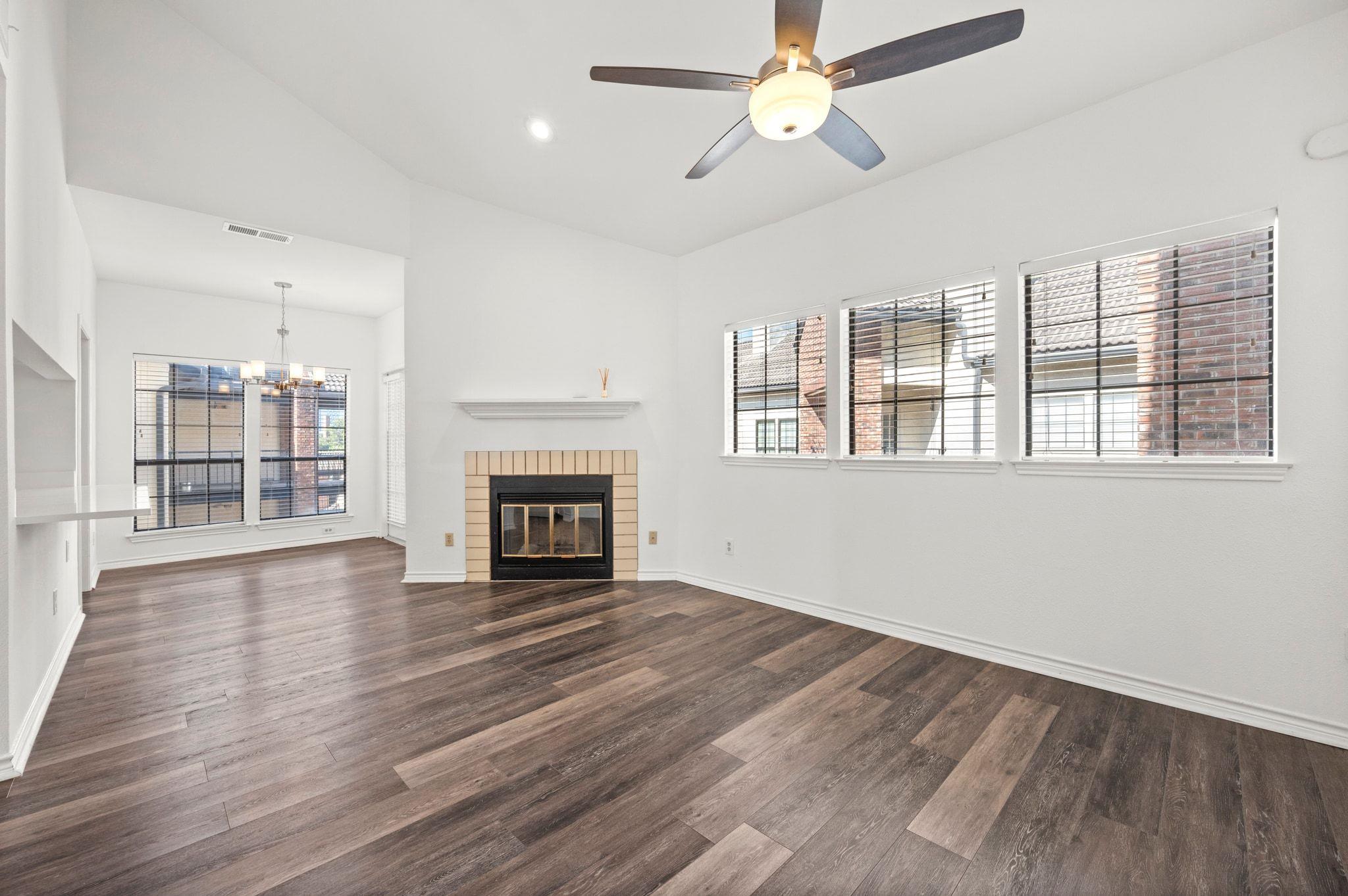 Inside, soaring ceilings, abundant storage, and thoughtful bedroom separation set the stage. The kitchen now features a counter-height bar that opens dramatically to the living room, complete with sleek quartz counters. A cozy fireplace warms the spacious living and dining areas, all accented by fresh paint and wood-style flooring.