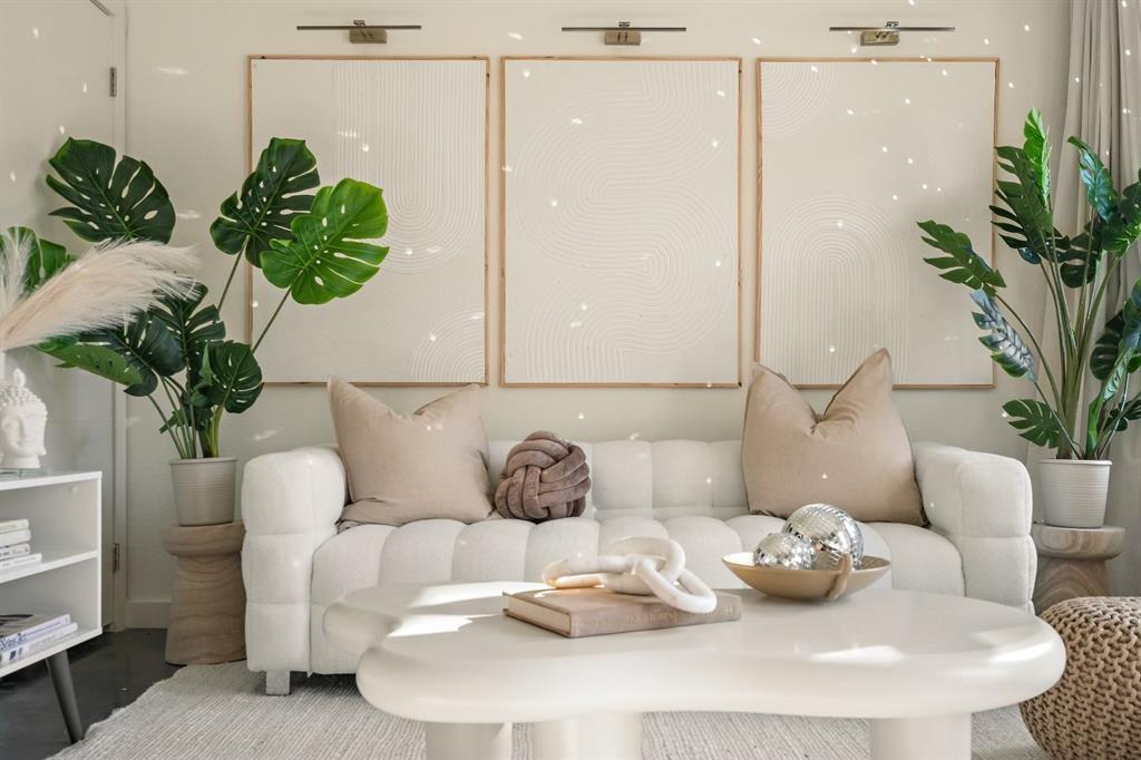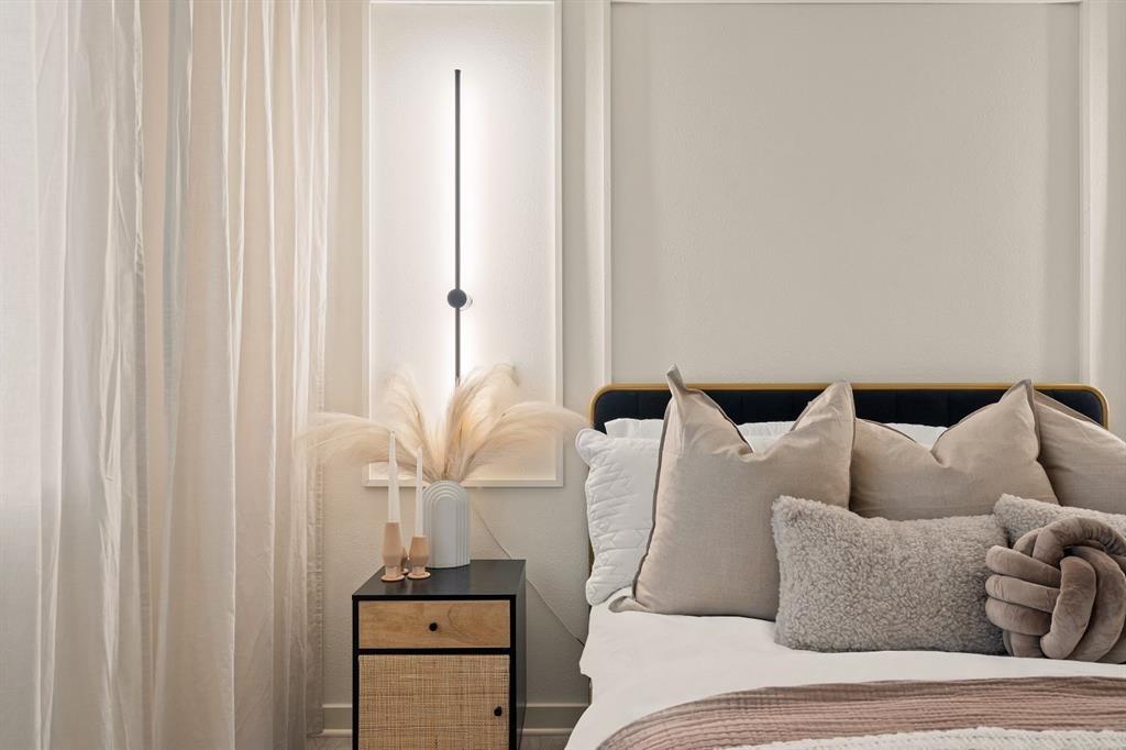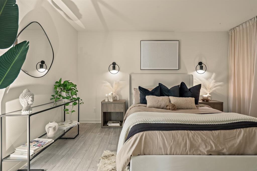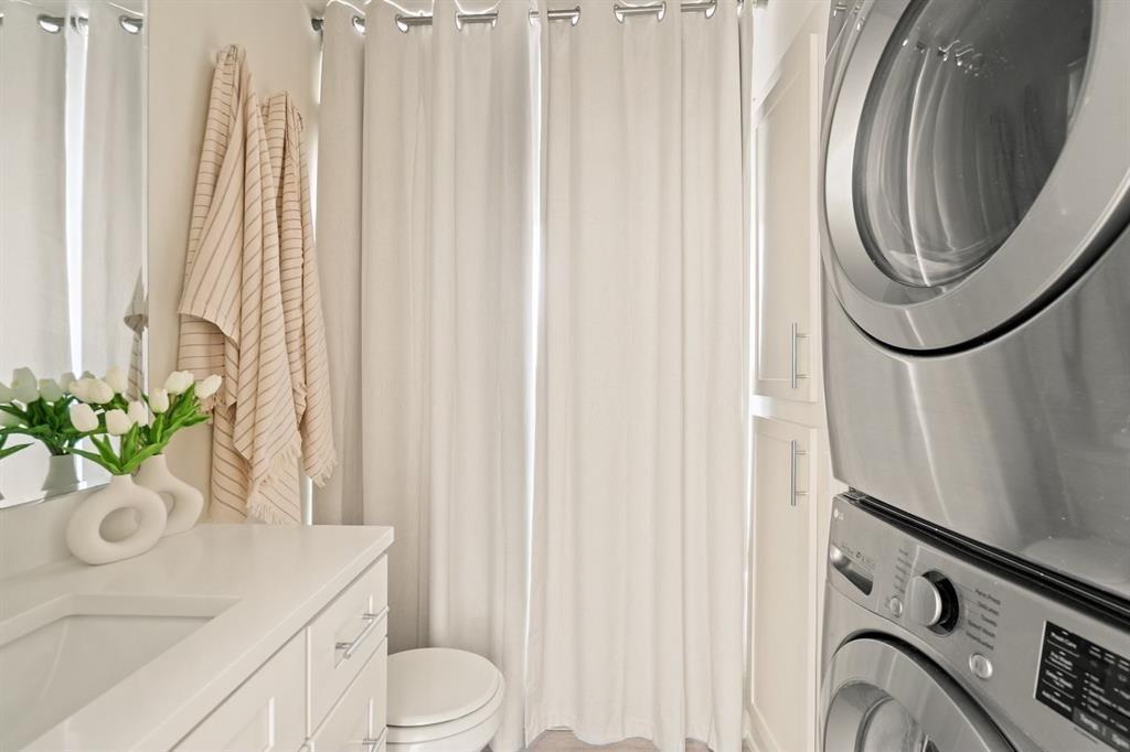 The spacious living area offers flexibility for relaxing or hosting, with large windows that bring in abundant sunlight. Both bedrooms are comfortably sized and styled with soft neutral tones, modern lighting, and updated flooring. The bathroom has been tastefully remodeled with clean lines and fresh finishes. A dedicated in-unit washer and dryer add everyday convenience.