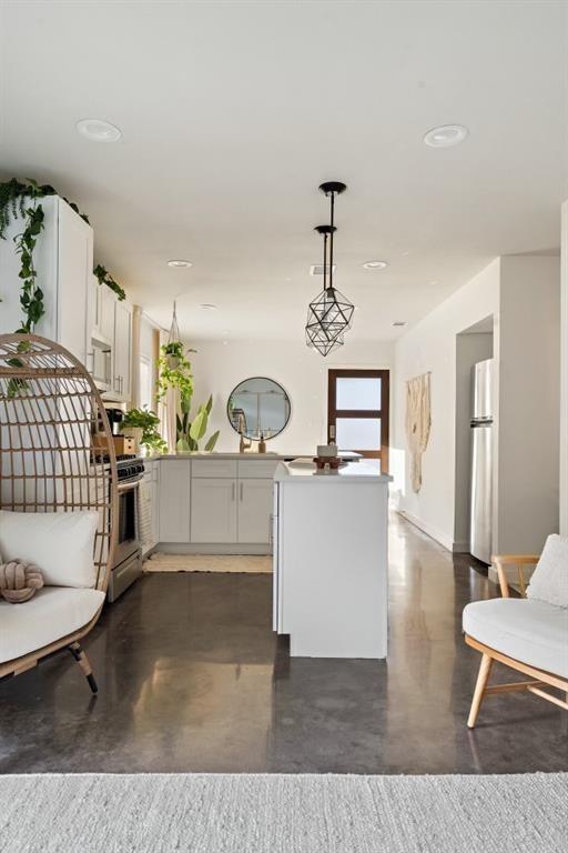Step inside to an open-concept living and kitchen space filled with natural light, polished concrete floors, and a clean, contemporary aesthetic. The fully updated kitchen features white shaker cabinetry, sleek quartz countertops, stainless steel appliances, gas range, dishwasher, and a large center island perfect for cooking and entertaining. Designer pendant lighting and thoughtful finishes create a bright, elevated feel throughout.